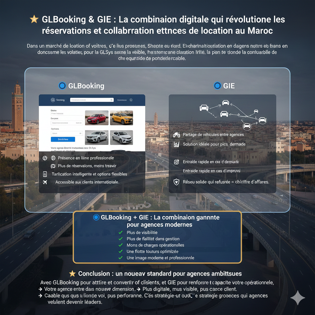 C’est dans ce contexte qu’est née GLBooking GIE Digital, une innovation 100 % marocaine qui transforme les agences de location en un réseau collaboratif puissant, capable de rivaliser avec les multinationales. GLBooking n’est pas seulement un système de réservation : c’est un nouveau modèle économique, une force collective et une révolution digitale.
